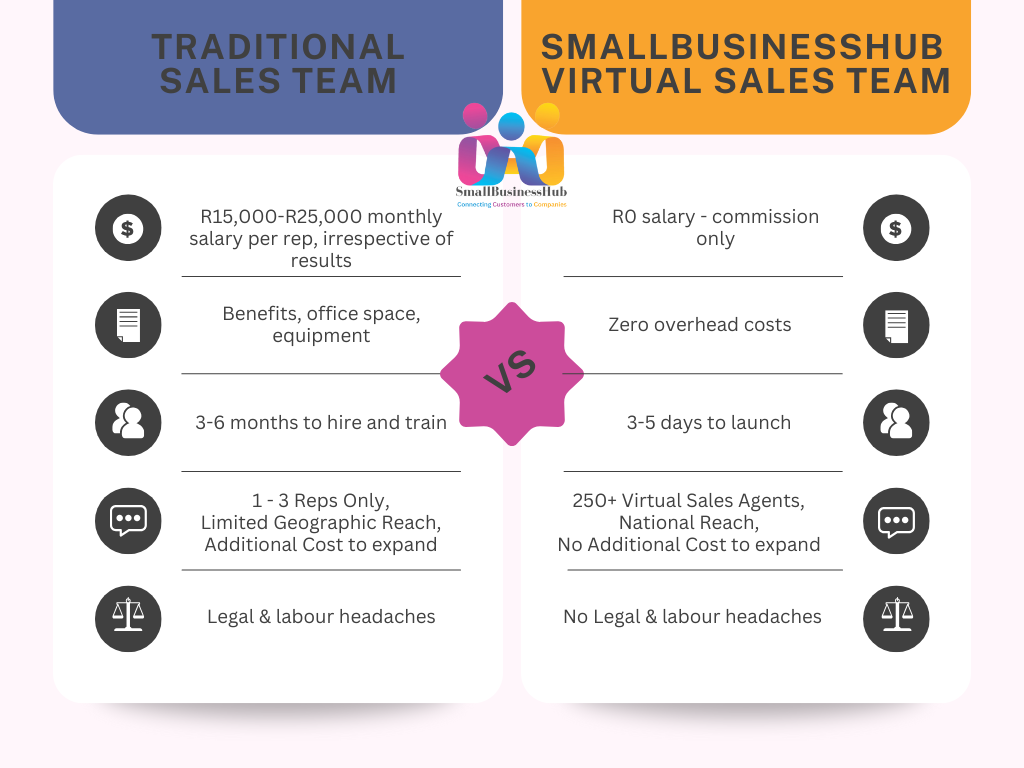 SmallBusinessHub connects you with 250+ hungry, motivated virtual sales agents who work across all regions of South Africa. They only earn when you earn. No salaries. No benefits. No office space. Just results.